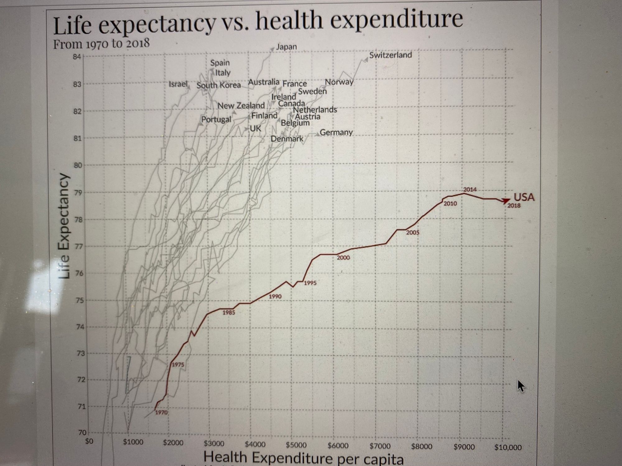 Look how much more we spend and look how much longer everyone else lives!
